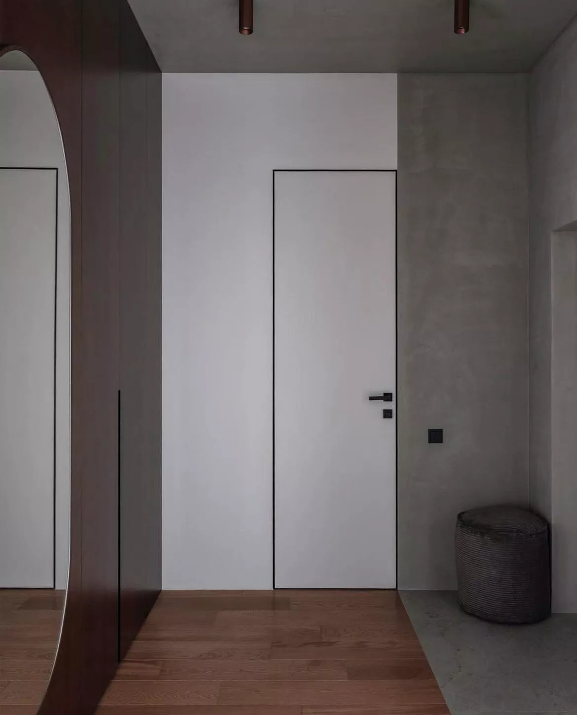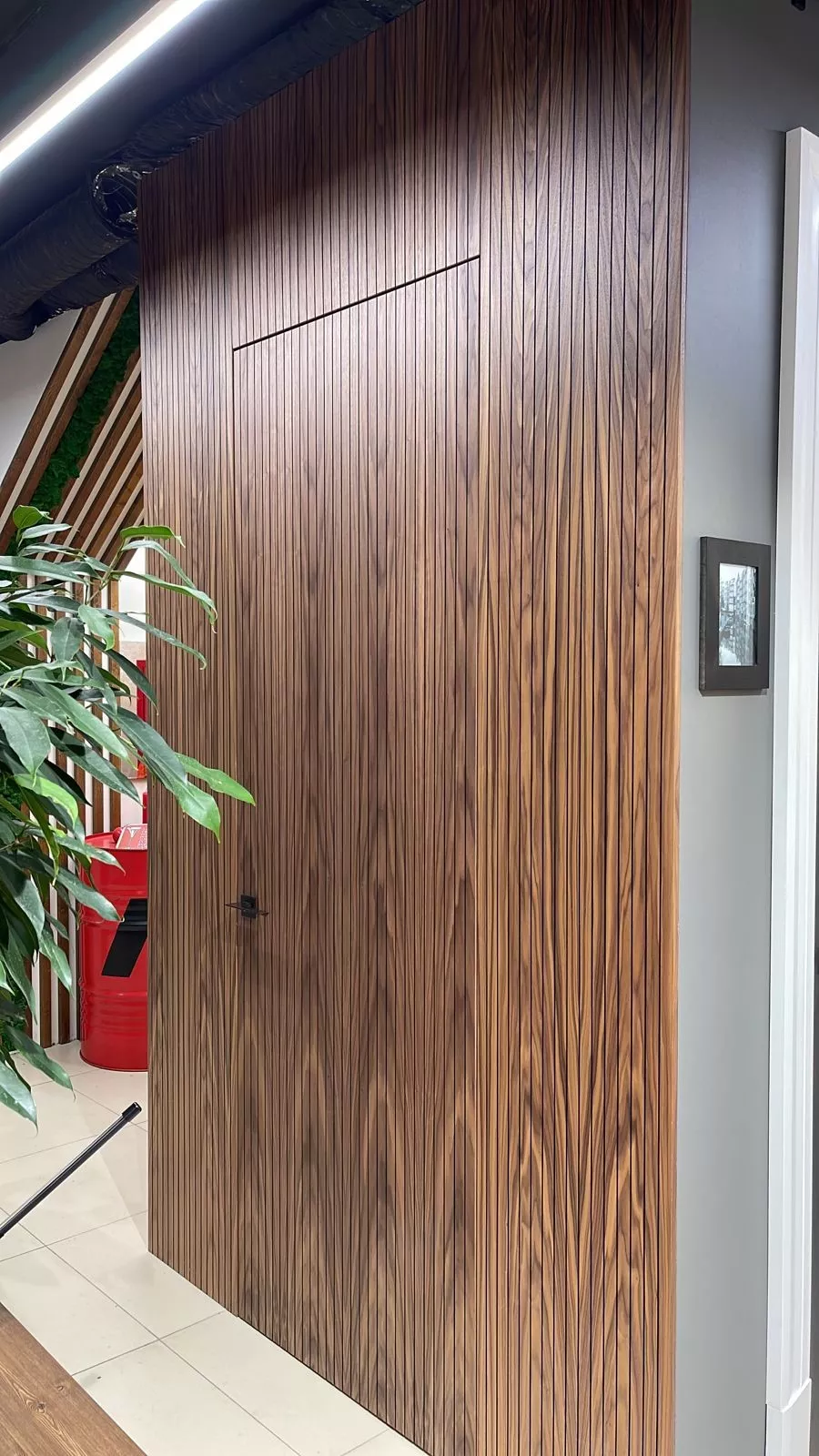- Скрытые (невидимые): двери, которые сливаются со стеной – за счет идентичной отделки (окрашивание по палитрам RAL или NCS на производстве или отделка на объекте в материал, идентичный материалу стены) или стеновых панелей (накладки в единой плоскости с полотном, в идентичном цвете и фрезеровке).