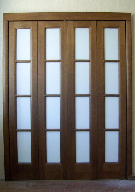 • воздухопроницаемость, способность пропускать влагу, не накапливая её, как следствие - стабильные размеры секций. Если купить двери-книжки из массива дерева планируется для ванной или кухни, лучше остановиться на сосновых створках;