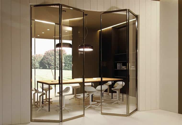 Складные системы в жилых и рабочих пространствах применяют не только для перекрытия межкомнатных проёмов, но и в качестве альтернативы стенам. Знакомясь с ценами и фото дверей-книжек в интерьере, будущий владелец найдёт немало эффективных и доступных вариантов использования таких решений в зонировании площадей. Например, они способны отделить: