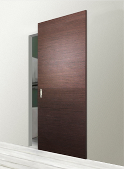• двери-пеналы. В данном случае скрытая система раздвижных дверей являет собой металлический каркас, состоящий из рельса, боковых стоек, рёбер жёсткости, уплотнителей. Все её составляющие встроены в стену. Туда же уходит сдвигаемая секция - для неё предусмотрена специальная внутренняя парковка.
