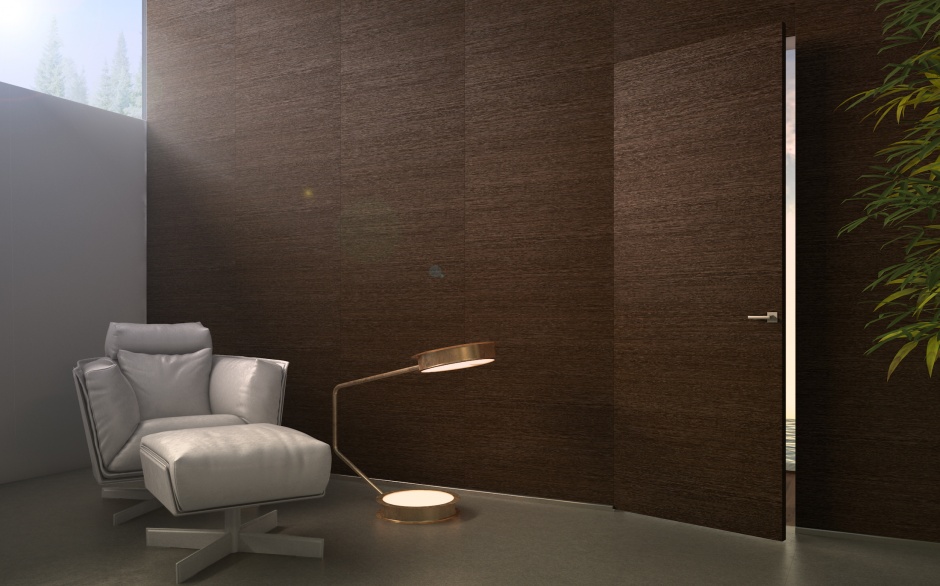 1. распашные. В наборе с такими изделиями поставляется запатентованная маскируемая коробка и петли-невидимки. Полотно в составе системы может быть обычным - шпонированным, окрашенным, ламинированным, с глянцевым эффектом, остеклённым, - либо грунтованным и предназначенным для последующего оформления. Выполняя изготовление скрытых дверей на заказ, крупные фабрики Италии и России предлагают купить створки высотой до 3 м, которые подходят для монтажа «в потолок». Конструкция на потайных петлях располагается компланарно по отношению к стене и подлежит полному маскированию;