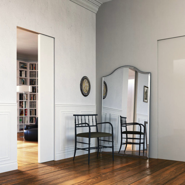 2. раздвижные. Особенность моделей заключается в том, что их встраивают в стену, используя специальный металлический пенал. Освобождая проход, секция плавно сдвигается и исчезает в нише, таким образом разгружая территорию, прилегающую к проёму. Подобные варианты открывания считаются наиболее компактными и рассчитаны на установку в самых маленьких и загруженных мебелью комнатах. Производство скрытых дверей под заказ позволяет получать продукцию любых размеров и конфигурации, нестандартного дизайна.