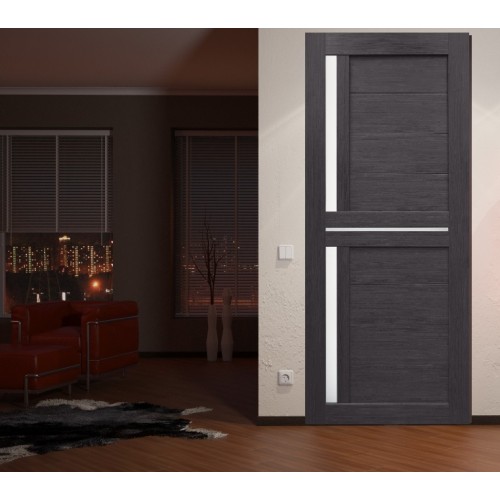 Epsilon. Дверь из тёмного экошпона, которую фирма предлагает купить ценителям современных стилей, обладает гладкой щитовой поверхностью. На тёмно-коричневом или чёрном фоне великолепно смотрятся тонкие серебристые линии, которые чертят молдинги. Динамичное сочетание изделия создают с узкими и крупными светопрозрачными элементами - белыми или чёрными.